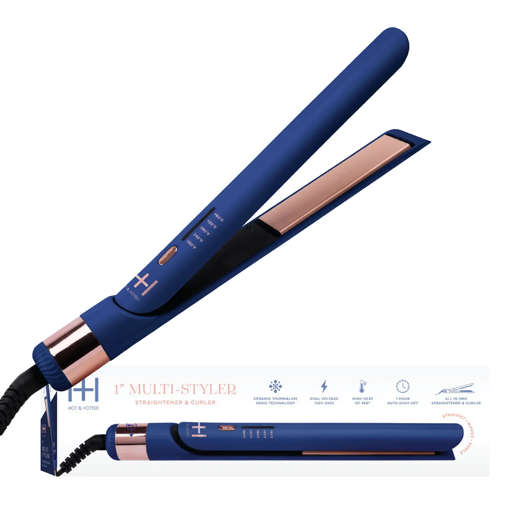 Introducing the ultimate styling tool for any hair type, Hot & Hotter's Multi-Styler 1 Inch Blue. With 5 heat settings up to 460Β°, ceramic tourmaline ionic technology, and a rapid heating time of 1 minute, this versatile hair straightener and curling iron provides a frizz-free and polished finish. Take it with you on your travels, thanks to its universal dual voltage range. Upgrade your styling game with this premier multi-styler!